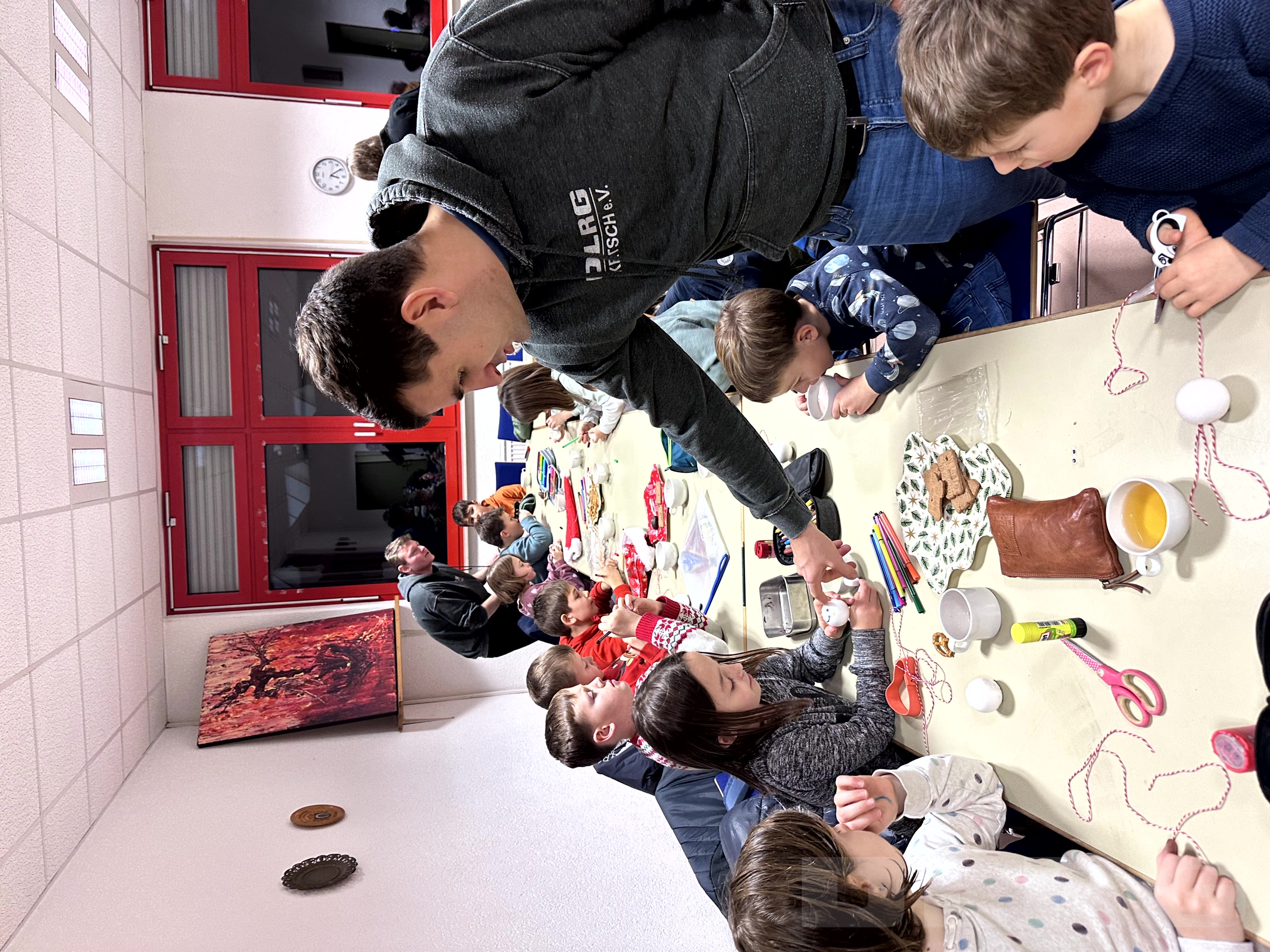 Zu Beginn begrüßten die Betreuer:innen alle Teilnehmenden und verteilten Kakao und Apfelschorle. Anschließend starteten wir mit dem Bastelangebot: einem Schneemann-Anhänger für den Weihnachtsbaum. Schnell entwickelte sich das Ganze zu einem richtigen Gruppenprojekt, bei dem sowohl Kinder als auch Betreuer:innen konzentriert zusammen bastelten. Am Ende entstand eine Vielzahl kreativer Anhänger – von Schneemännern über Monster bis hin zu Clowns.