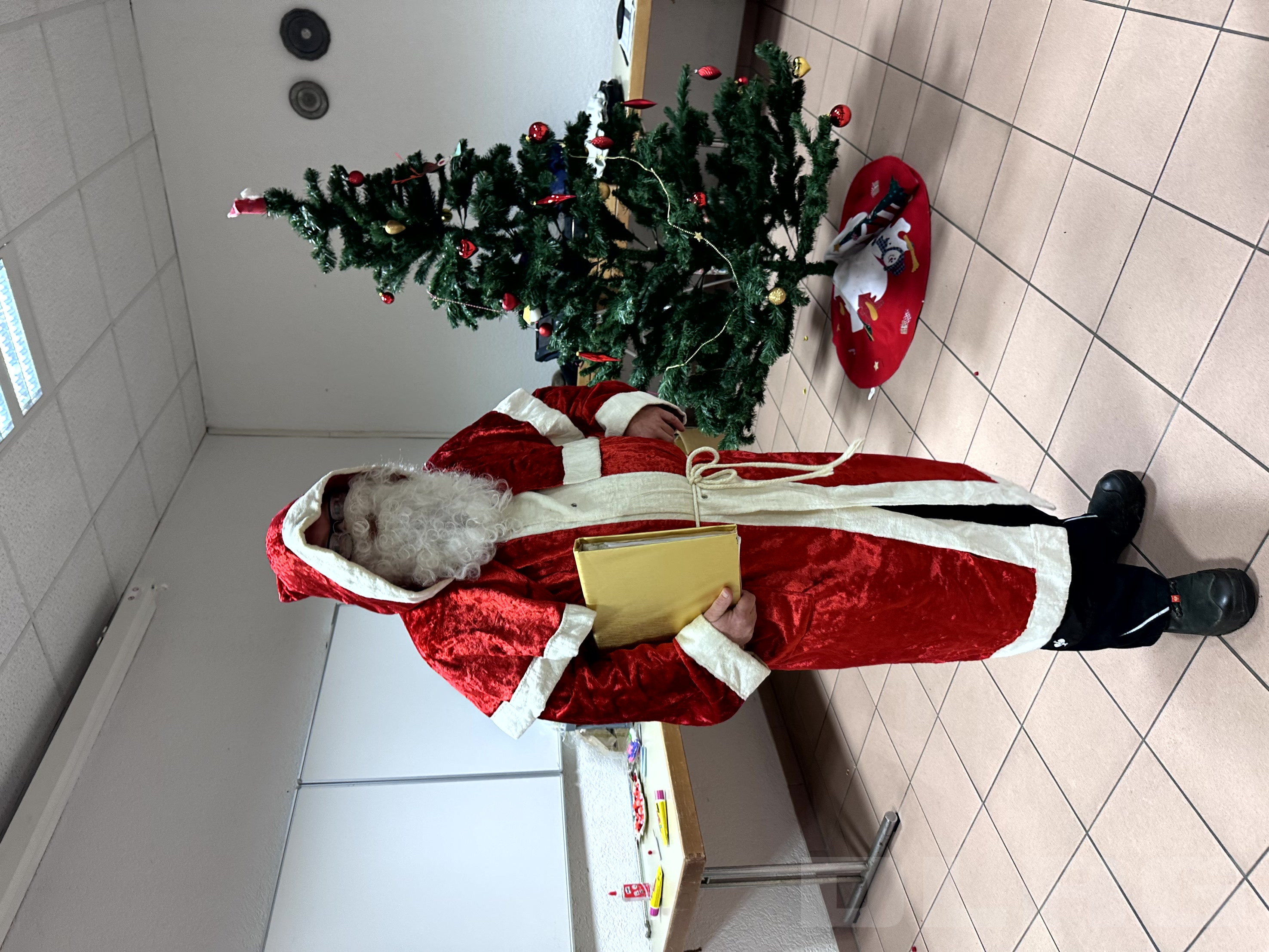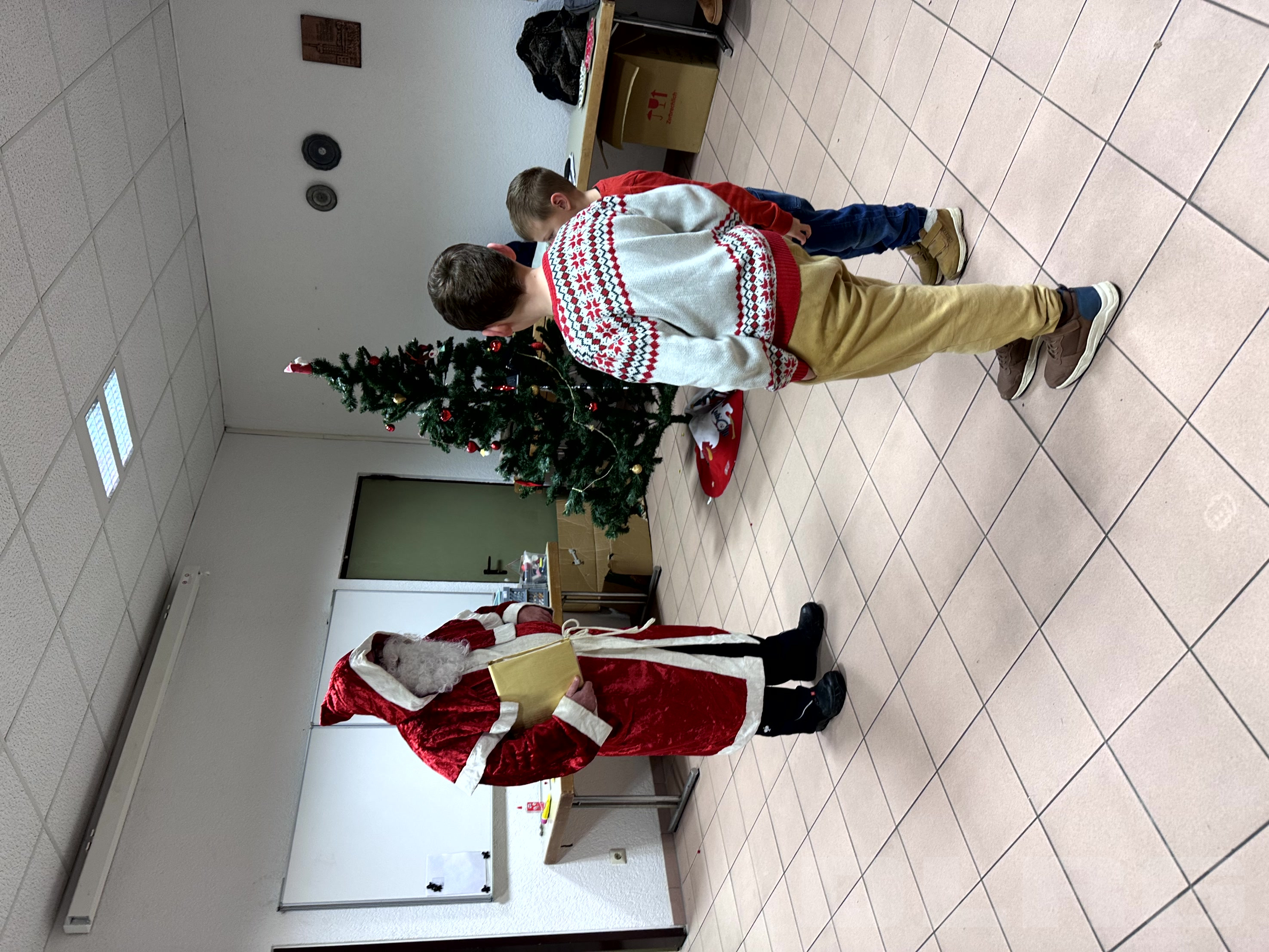 Nach dem erfolgreichen Basteln war plötzlich ein dumpfes Klopfen an der Tür zu hören: Der Nikolaus war da. Die Kinder wurden paarweise nach vorne gerufen, konnten ein Gedicht oder einen Witz vortragen und erhielten anschließend ein Geschenk – ein Tic-Tac-Toe-Spiel.